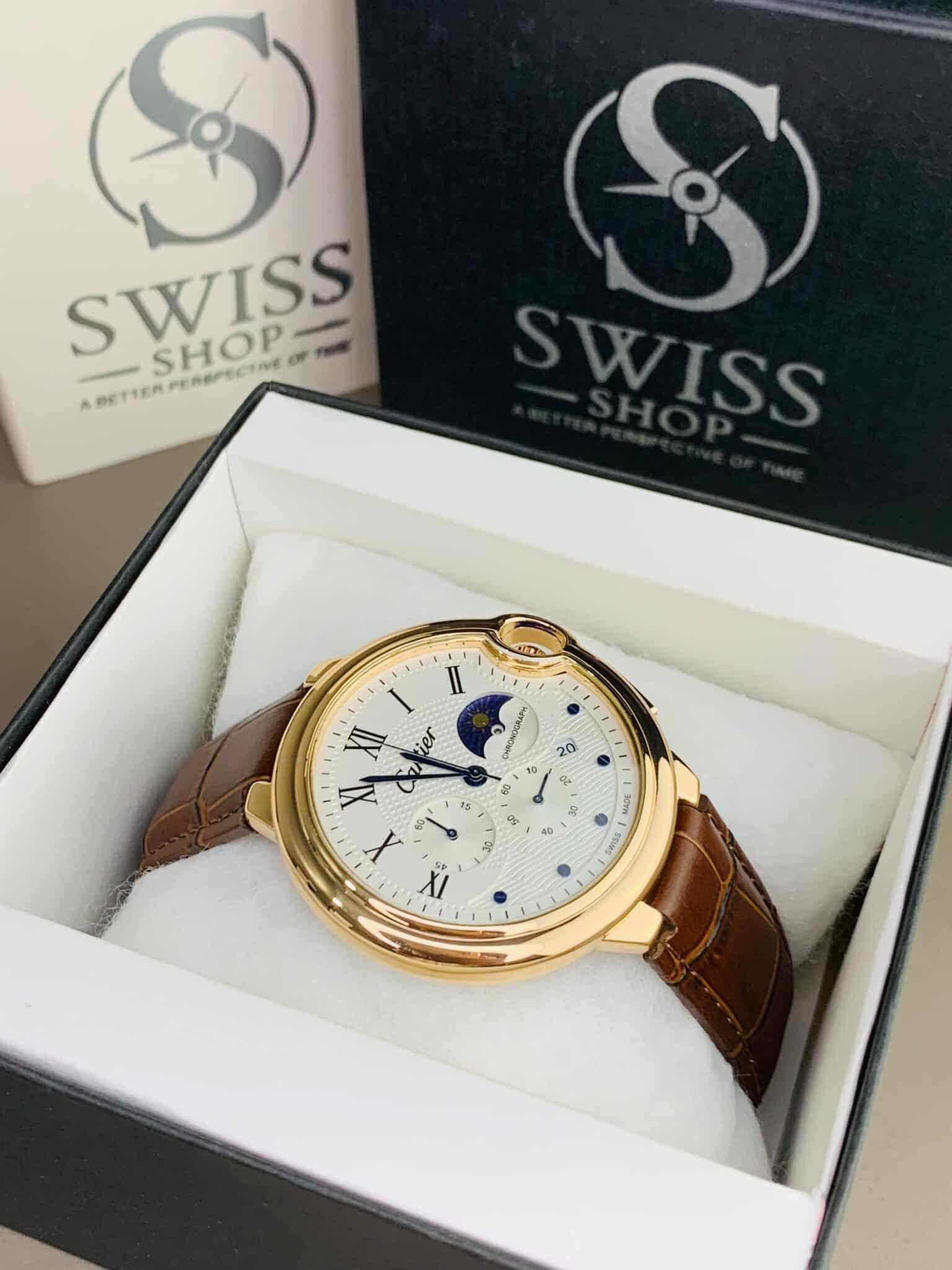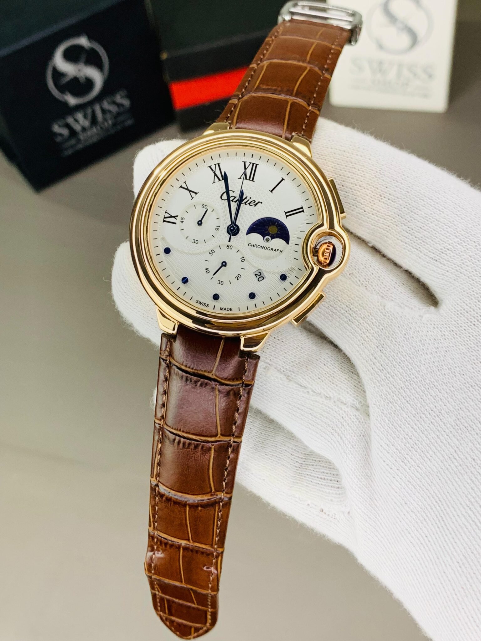The watch features a durable stainless steel case paired with a high-quality leather strap, ensuring comfort, strength, and long-lasting use. Its chronograph functions and moon phase display are fully working, adding both practicality and visual appeal to the dial.